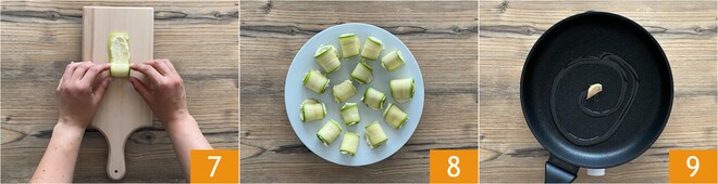 Enrole 7 formando um rolinho. Faça todos os rolinhos até usar todos os ingredientes 8. Prepare o molho: refogue o alho com o azeite em uma frigideira 9.