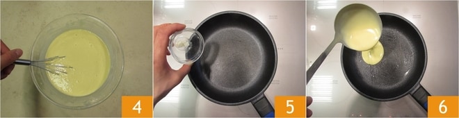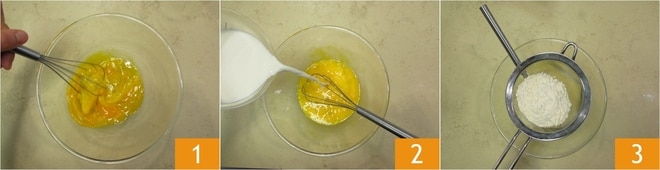 Para preparar os rolinhos de crepe recheados, comece fazendo a massa: bata o ovo em uma tigela 1 com uma pitada de sal, depois adicione o leite 2 e misture com o batedor. Peneire a farinha na tigela 3.