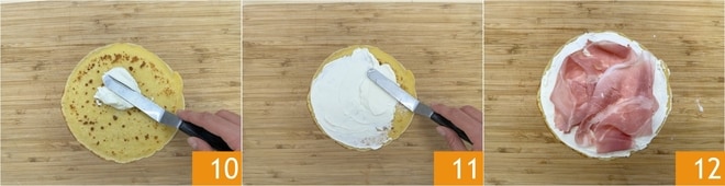 Para rechear as crepes, coloque-as sobre uma tábua e espalhe o queijo cremoso Philadelphia uniformemente sobre toda a superfície 10 11. Coloque por cima 2 fatias de presunto cozido 12.