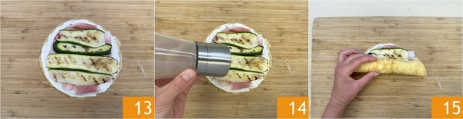 Adicione também as abobrinhas grelhadas 13 e, se desejar, uma pitada de pimenta do reino 14. Enrole delicadamente a crepe, pressionando levemente para o recheio aderir bem 15.