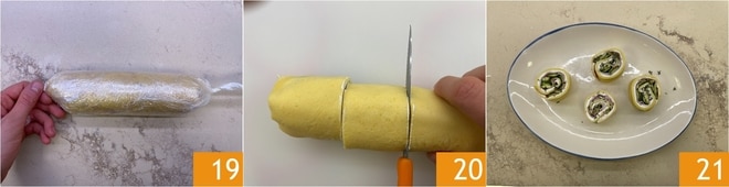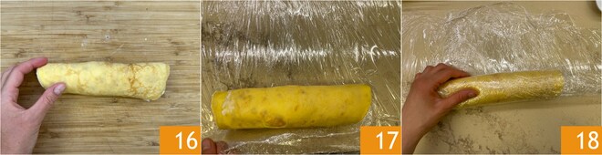 Uma vez obtido um rolinho 16, enrole-o bem com filme plástico 17 18.