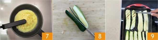 Uma vez cozida 7, transfira a crepe para um prato e continue cozinhando as outras até a massa acabar; com essas quantidades, você deve conseguir 4. Nesta altura, lave bem as abobrinhas em água corrente, corte as pontas e corte no sentido do comprimento em fatias finas de cerca de 2-3 mm 8. Aqueça uma grelha e grelhe as fatias de ambos os lados, até ficarem macias e ligeiramente tostadas 9, depois deixe esfriar.