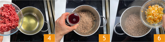 Adicione a carne moída 4, desfie com a colher e deixe dourar até que o fundo esteja seco. Em seguida, adicione o vinho 5 e deixe o álcool evaporar, depois adicione o picadinho de legumes 6.