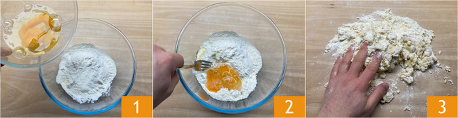 Para preparar os rolinhos de massa com espinafre, comece pela massa fresca: coloque a farinha e os ovos em uma tigela 1, depois misture com um garfo para integrar 2. Transfira a mistura para a bancada de trabalho e continue a amassar com as mãos 3.