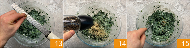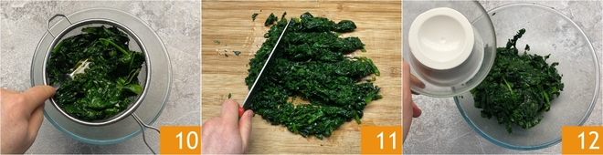 Escorra os espinafres cozidos em uma peneira e pressione-os para eliminar o excesso de líquido 10, depois deixe-os esfriar. Quando estiverem bem escorridos, pique os espinafres com a faca 11 e transfira-os para uma tigela, depois acrescente a ricota 12 e misture bem.