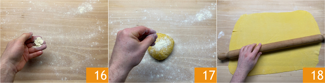 Após o tempo de descanso da massa, polvilhe levemente com sêmola tanto a bancada de trabalho 16 quanto a massa 17, depois estenda-a para formar um retângulo de cerca de 50x30 cm, com espessura de alguns milímetros 18.