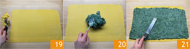 Refine as bordas do retângulo 19, depois acrescente a mistura de espinafres 20 e espalhe uniformemente com uma espátula, deixando livre uma borda de 1 cm nos lados mais longos 21.