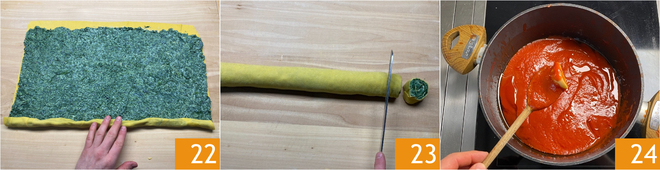 Enrole delicadamente a massa começando pelo lado mais longo 22, depois corte o rolo obtido em fatias com cerca de 3 cm de largura; com estas quantidades, você obterá 15-16 rolinhos 23. Enquanto isso, o molho estará pronto, então retire o dente de alho 24.