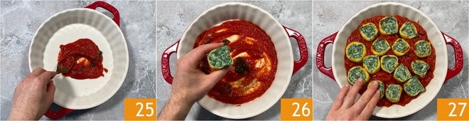 Agora você pode montar tudo: pegue uma travessa com cerca de 28 cm de diâmetro e distribua bastante molho de tomate no fundo 25, depois disponha as rodelas com a parte cortada voltada para cima 26 e pressione-as delicadamente para alargá-las 27.