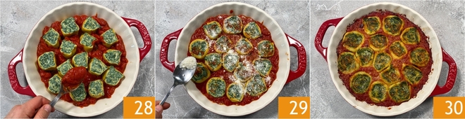 Cubra os rolinhos com o pouco molho restante 28 e polvilhe a superfície com o queijo ralado 29. Cozinhe em forno estático pré-aquecido a 180° por 30 minutos, depois ative a função grill por mais 3 minutos. Uma vez gratinados, seus rolinhos de massa com espinafre estão prontos para serem servidos 30!