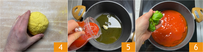 Quando conseguir uma massa lisa e homogênea 4, envolva-a em filme plástico e deixe descansar em temperatura ambiente por pelo menos 30 minutos. Enquanto isso, prepare o molho: em uma panela, refogue o alho no azeite, depois adicione o molho de tomate 5 e um pouco de água, apenas o suficiente para limpar a jarra. Tempere com sal e folhas de manjericão 6 e cozinhe em fogo baixo por cerca de 40 minutos.