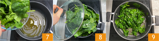 Enquanto isso, cuide dos espinafres: em outra panela, refogue o alho no azeite, depois adicione os espinafres já limpos 7. Tempere com sal, cubra com a tampa 8 e cozinhe em fogo médio por cerca de dez minutos, apenas o tempo necessário para murchá-los ligeiramente 9.