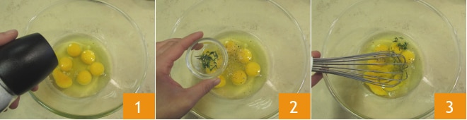 Para preparar os rolinhos de omelete, primeiro quebre os ovos em uma tigela, adicione sal 1, pimenta e aromatize com algumas folhas de tomilho fresco 2. Bata os ovos com um batedor 3.