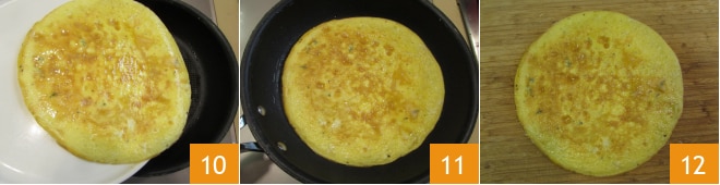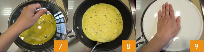 Cubra com uma tampa 7 e cozinhe em fogo moderado por cerca de 5 minutos ou até que a omelete esteja um pouco firme para poder virá-la 8. Neste ponto, coloque sobre a omelete um prato plano da mesma circunferência da frigideira 9.