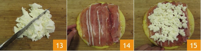 Escorra e pique a muçarela 13. Coloque as fatias de speck 14 na omelete e espalhe a muçarela picada 15 distribuindo o recheio de forma homogênea.