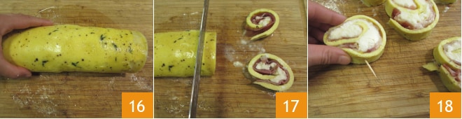 Enrole a omelete 16. Corte o rocambole em fatias, obtendo assim oito rolinhos 17 que você prenderá com um palito de dente 18.