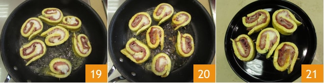 Na mesma frigideira em que você cozinhou a omelete, doure os rolinhos em ambos os lados 19 até que uma crosta dourada se forme 20. Retire o palito dos rolinhos e sirva-os bem quentes e derretidos 21.