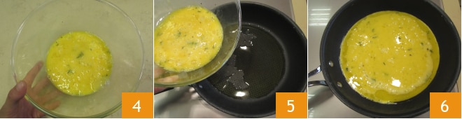 Uma vez que a mistura esteja homogênea 4, aqueça um fio de óleo em uma frigideira de 24 cm de diâmetro e adicione os ovos 5.