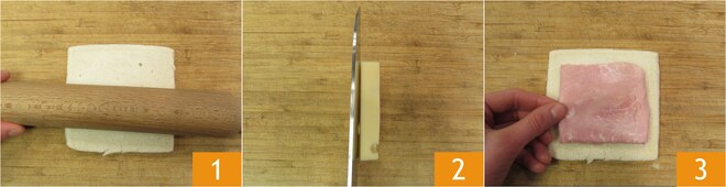 Para preparar os rolinhos de pão de forma, presunto e queijo, com o rolo de massa, achate as fatias de pão 1. Corte o queijo em fatias ligeiramente menores que o pão e com cerca de 1 cm de espessura 2. Recheie o pão com uma fatia de presunto 3.