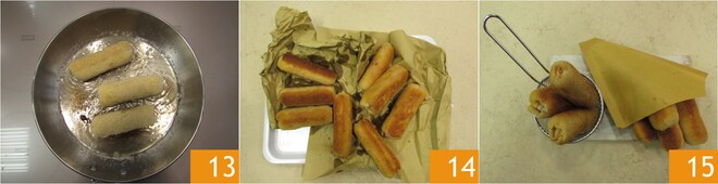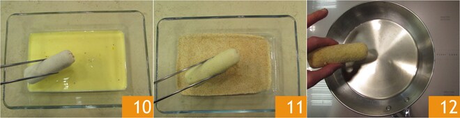 Molhe cada rolinho no leite e no ovo 10 e depois na farinha de rosca 11. Aqueça um fio de óleo vegetal na frigideira e coloque os rolinhos 12.