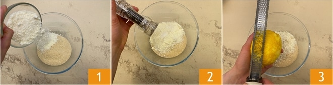 Para preparar os rolinhos de peito de frango e abobrinha, comece pela cobertura: em uma tigela, coloque a farinha de rosca e o Parmigiano Reggiano DOP ralado 1. Tempere com sal, pimenta 2 e as raspas de um limão 3.