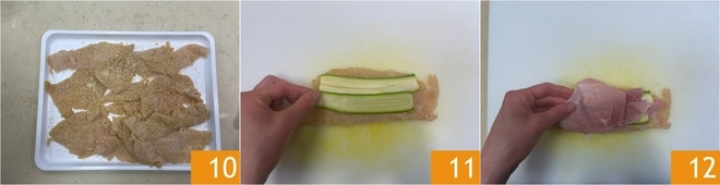 Continue assim até cobrir bem todas as fatias de ambos os lados 10. Agora, coloque uma sobre uma tábua de cortar, posicione em cima algumas fatias de abobrinha 11 e adicione uma fatia de presunto cozido 12.