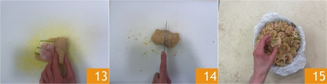 Enrole para formar um rolinho 13, depois divida ao meio 14. Coloque os rolinhos em uma forma grande de cerca de 22 cm forrada com papel manteiga 15.