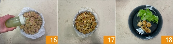 Polvilhe com a cobertura restante e adicione um fio de óleo 16. Asse em forno ventilado a 180° por cerca de 30-35 minutos, até dourar 17. Transfira os rolinhos de frango e abobrinha para um prato e sirva imediatamente 18!