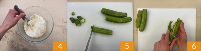 Misture 4 e reserve por um momento. Agora lave bem as abobrinhas e corte as pontas 5, depois fatie-as com um descascador ou um mandolim 6.