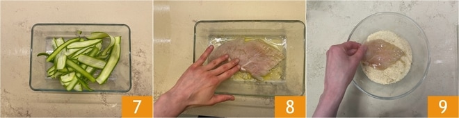 Você deve obter fatias muito finas, com cerca de 1 mm de espessura 7. Neste ponto, pegue as fatias de peito de frango; elas devem ser finas. Passe-as primeiro no óleo dos dois lados 8 e depois na cobertura 9.