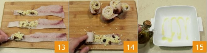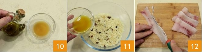 Recupere também o líquido de molho das passas, adicione 20 ml de azeite de oliva 10 e junte ao recheio 11. Pegue as fatias de peixe-espada, você pode pedir na peixaria fatias com cerca de 4-5 mm de espessura ou cortá-las você mesmo de um único pedaço usando uma faca para filetar peixe ou, alternativamente, usar o cortador de frios. Em seguida, retire a pele das fatias de peixe-espada 12