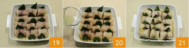 coloque os rolinhos próximos uns dos outros com a parte da abertura voltada para baixo 16. Polvilhe a superfície com o recheio restante 17, depois coloque as folhas de louro entre um rolinho e outro como se fossem pequenas asas 18.