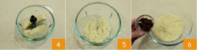 coloque o miolo em um processador 4 e triture finamente 5, em seguida, coloque em uma tigela e adicione as passas previamente escorridas 6.