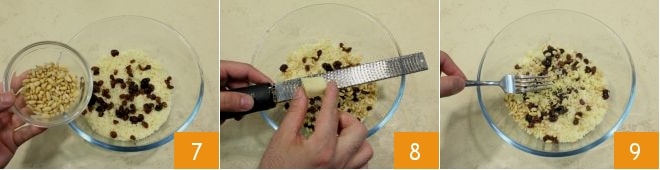 Adicione também os pinhões 7 e rale o gengibre fresco 8, salgue e apimente a gosto, em seguida, misture todos os ingredientes 9