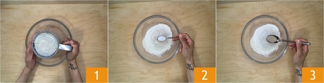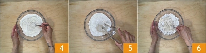 Misture para integrar os ingredientes 4. Despeje a água aos poucos 5, amassando diretamente na tigela 6