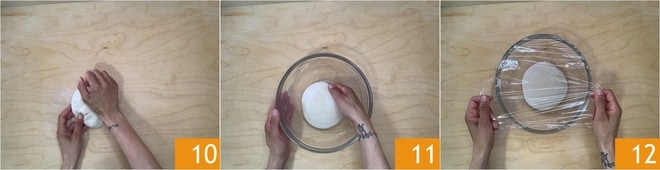 Continue amassando até que o bolinho fique liso e homogêneo 10. Transfira-o para uma tigela 11 e cubra com filme plástico 12