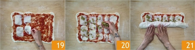 Coloque as fatias de provolone 19 e as azeitonas sem caroço em rodelas 20. Enrole delicadamente pelo lado mais comprido 21