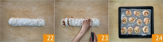 Certifique-se de deixar a parte da junção do rolo virada para baixo 22. Agora, com uma faca, faça 11 rolinhos com cerca de 2,5 cm de largura 23. Transfira-os delicadamente para uma assadeira forrada com papel manteiga e levemente polvilhada com farinha 24.