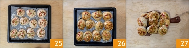 Deixe crescer por mais 30 minutos 25. Neste ponto, asse em forno ventilado pré-aquecido a 200°C, na prateleira central por 15 minutos. Quando estiverem bem dourados, retire do forno e sirva seus rolinhos 27.