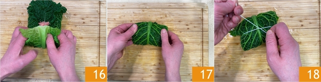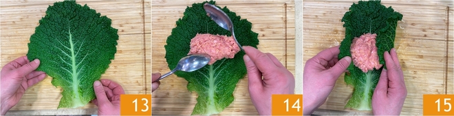 Agora você pode montar os rolinhos: pegue uma folha de repolho e estenda sobre uma tábua 13, depois distribua uma porção de recheio no centro 14 e dobre as bordas laterais para dentro 15.<\/p>
