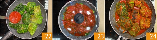 Despeje então o molho preparado anteriormente 22, cubra com uma tampa 23 e cozinhe em fogo baixo por pelo menos 10 minutos 24, para que os rolinhos absorvam o sabor e permaneçam macios.<\/p>
