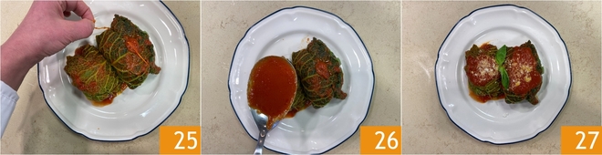 Coloque os rolinhos no prato e retire o barbante 25, depois regue com o molho 26. Seus rolinhos de repolho com carne estão prontos para serem servidos ainda quentes 27!<\/p>