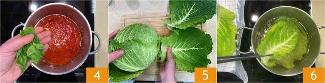No final do cozimento, aromatize com algumas folhas de manjericão fresco 4 e reserve o molho. Enquanto isso, foque no repolho: elimine as folhas externas mais danificadas, depois separe cuidadosamente as centrais maiores, perfeitas para formar os rolinhos 5. Leve uma panela com água salgada para ferver e escalde as folhas por cerca de 3 minutos 6, apenas o tempo suficiente para amolecê-las.<\/p>