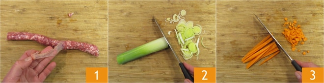 Para preparar os rolinhos de repolho recheados, corte a linguiça e retire a pele 1, em seguida, desfie-a e reserve, limpe o alho-poró e fatie-o 2, depois limpe a cenoura e corte-a em cubinhos 3.