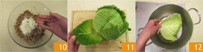 Aromatize com as folhas de tomilho 10. Misture e deixe esfriar. Enquanto isso, retire 8 folhas grandes do repolho 11, tomando cuidado para usar as menos escuras, em seguida, lave-as e cozinhe-as em água salgada por 5 minutos 12.