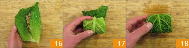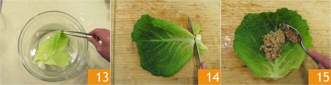 Escorra-as e coloque-as em uma bacia com água fria para interromper o cozimento. Em seguida, seque-as. Elimine a parte final da folha que é mais dura 14. Recheie as folhas de repolho no meio com 2-3 colheres generosas de recheio 15.