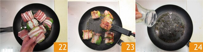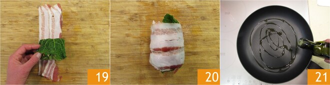 Envolva cada rolinho com 2 fatias de bacon ligeiramente sobrepostas 19 20, de forma a cobrir quase completamente o pacotinho. Aqueça um fio de azeite na frigideira 21.