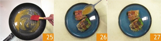 Grelhe os rolinhos 22 por alguns minutos de todos os lados 23. Coloque os rolinhos de lado por um momento e deglace o fundo com o vinho branco 24.