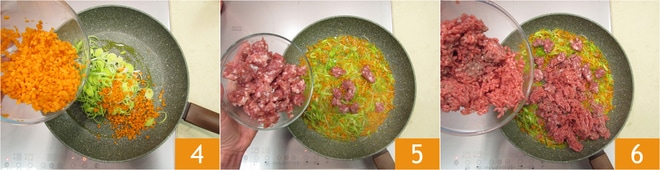Em uma frigideira com um fio de azeite, refogue em fogo baixo o alho-poró e a cenoura 5 por alguns minutos, em seguida, adicione a linguiça e a carne moída 6.
