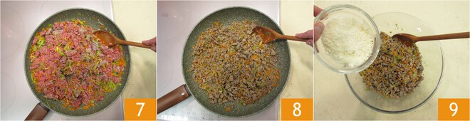 Misture 7 e cozinhe por 10 minutos. Quando o ragu estiver pronto 8, transfira-o para uma tigela e adicione o queijo ralado 9, o sal e a pimenta.